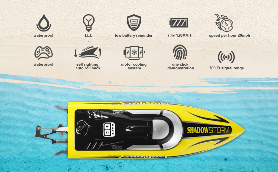 This weather-resistant RC boat is the perfect companion for any water adventure. With a top speed of 20 MPH and a 4-channel remote control with a 400 ft signal range, you'll never get lost at sea. The self-righting functions and easy-to-use radio controller make it simple and safe to operate, even for beginners. The water sensor switch, low battery reminder, and out-of-range warning ensure a smooth and protected journey.